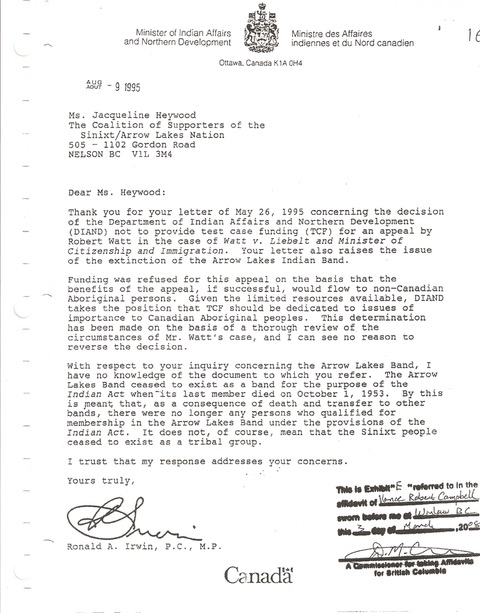 With the recent R. v. Desautel court case ruling on hunting rights, misleading headlines claim that Sinixt extinction is now over. Sinixt Peoples are not extinct, it is the only Band recognized in Canada that was deemed extinct by the Government of Canada in 1956, as demonstrated by the letter above. Sinixt extinction as a Band, for purposes of the Indian Act in Canada, remains unchanged. Please read our 23 April 2021 press release for our full response to the Desautel case media coverage.